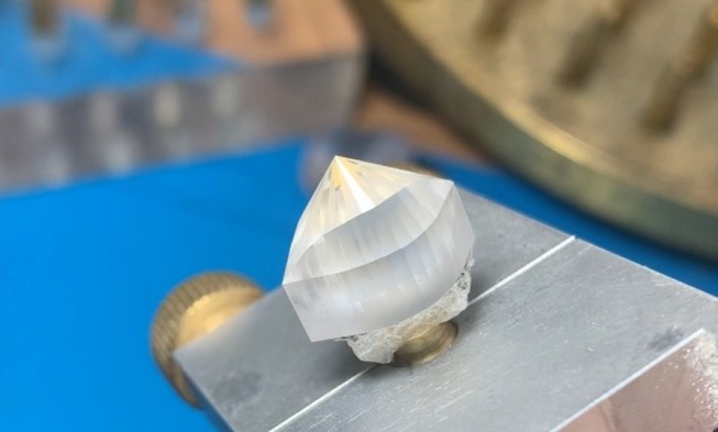 The first major stage is cutting the pavilion, which is the lower, pointed part of the gemstone. This area plays a crucial role in returning light through the stone to the viewer’s eye. Unfortunately, in many commercially available gemstones, pavilion angles are often compromised in favour of maximizing carat weight, which sacrifices brilliance, scintillation and light return.